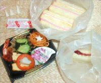 お嬢のお弁当にあわせて今日はパパもサンドイッチに。 おじさんがジャムサンドを食べるっていうのもなんだかなぁ( ̄〜 ̄)でも余ったんだからもっていっていただきましょ♪これからは毎朝パパのお弁当だけの日々になります。私がお嬢のお弁当にかけた情熱をパパ弁当にむけるか、それともこのままを維持か?ご期待くださいませm(_ _)m ・サンドウィッチ(はむ&チーズマスタード、いちごジャム) ・塩もみきゅうり ・エビフライ ・人参のグラッセ ・おから入りオムレツ ・特製トマトソーススパゲッティー ・こんにゃくゼリー |