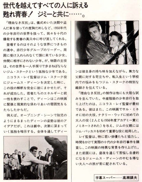 | ●タイトル/他 | 〓理由なき反抗〓 ・監督:ニコラス・レイ ・主演:ジェームス・ディーン他 |