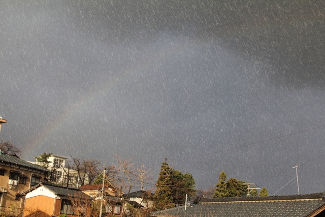 厚く暗い雲が立ちこめた朝。東の空に雲の隙間ができ、朝日がさして西の空に虹ができました。しかしそれとほぼ同時にバラバラと雹がトタン屋根にあたる音。急いで自宅2階のベランダに上り、雹が降る中に見えた虹を撮影しました。
