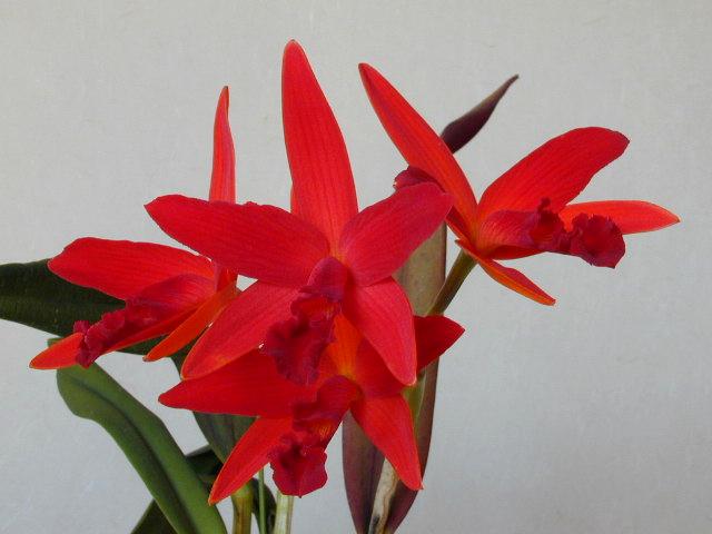 Slc. Kagaribi Dawn 'Red Star' ソフロレリオカトレヤ カガリビ・ドーン ’レッドスター’ ’01/3/24 撮影 花径 9 cm、のミディカトレヤ。 濃赤色で、特にペタル、リップ は角度によって黒赤色に見える。