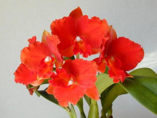 ソフロレリオカトレヤ サンライズ ドール ’アエカ ヴィーナス’ ( ’01/2/3 撮影 ) 1花茎に 5花もついたせいか 花径は 7cmとやや小さい。 (4花の株は 8cm あった) 繁殖力強く、朱赤色の 花色も素敵です。