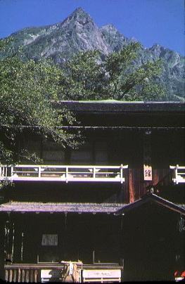 吉城屋の前に着く。左に行くと吊り橋を渡って明神池迄10分程。