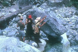 夜行列車で来て上高地出発が7時頃だと、この辺で昼過ぎ、30Kg前後の大荷物が肩に食い込み、足元がふらついてくる頃昼食の大休止となる。 |
