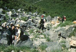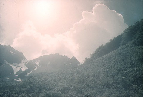 本谷橋からは、樹林帯の中のつづら折れの急坂の登りとなる。夜行列車の疲れが出てくる頃、この登りはきつい。背中の荷物が肩に食い込み、流れ落ちる汗が足元の岩を濡らす。呼吸を整え足元を見つめて、ひたすら一歩一歩と足を運び上げる。一本立てる回数が多くなる。