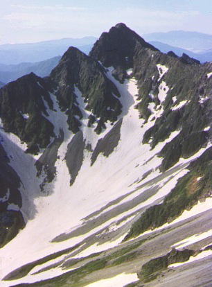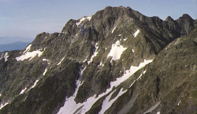 右 ; 同じ場所から見た 奥穂高、右端にジャンダルム。