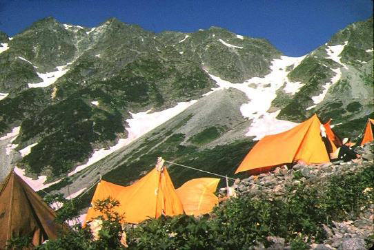 キャンプの朝。 紺碧の空に奥穂高の 稜線が聳えている。 右手雪渓上の鞍部が 白出(しらだし)のコル。 ここに穂高小屋があり、 雪渓右手の尾根 (ザイテングラード)を 辿る。 案内書のコースタイム は、登り 2.5 時間。 (’59/8/2 撮影 )