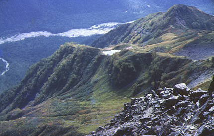 左 ; 四峰より奥又白側を見下ろす。昨日立ち寄った奥又白池が