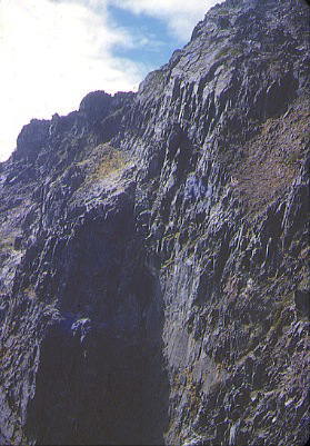 右 ; 四峰に立つと、目の前に 前穂東壁 の絶壁が迫っている。