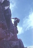 | この年の夏の合宿では奥穂南稜、滝谷・ドーム中央稜を登ったが、いま一つ達成感がえられなくて、もやもや した気分でいたところ、相棒のM君に誘われ、後輩のI君と3人で滝谷に挑戦することになった。 (第1日・9/2) 今回は北穂小屋泊まり、登攀用具のザイルや金物はあるものの、合宿の時にくらべれば格段に少ない荷物 のサブザックで、涸沢からは北穂東稜の岩登りも楽しみながら、そして最後は夕立に追いかけられながらも、 明るいうちに小屋に入ることができた。 (第2日・9/3) 濃いガスで見通しのきかないB沢の急傾斜を、いつ落石が来るかと緊張感いっぱいで下降すること1時間強。 取り付き点への細いバンドを見つけてトラバース、第一尾根側にまわりこんで、登攀開始。 オーダーは、M・私・I の順でザイルを結ぶ。クラック尾根の名前通り、殆どクラックとリッジの登り、30mザイル 2本で、尺取虫のように、クライミングとジッヘルを繰り返す。天気はキリション、時々トップの姿がガスの中に 消える。 ミドルでは写真撮影のチャンスは全くないが、このルートのクライマックス、通称じゃんけんクラックで、一寸の間 I 君にジッヘルをたのんで、なんとかシャッターを押すことができた。 核心部を過ぎる頃から雨粒が大きくなりだし、近くの岩小屋に逃げ込んで一服していたが、ここはつい先年の 11月はじめ、季節外れの猛吹雪で滝谷で数パーティーが遭難した時、この岩小屋でも何人かが疲労凍死した ところらしいと判って早々に立ち退いた。 (小屋発;7.10、登攀開始;8.30、めがねのコル;9.10、T5;10.40、T8;11.05、終了;11.20 ) 小屋に戻って昼寝をしているうち雨があがり、そのまま寝ているのも勿体ないと第二尾根にでかけた。 このルートは前年M先輩に連れて行ってもらった滝谷の入門コース。 主稜をくだり、適当な地点で北山稜にトラバース。ほとんどフリークライミングで、P2直下の1ピッチと、前回 混雑していてパスしたP1下の水野クラック 1ピッチのみザイルを結んだ。( 14.50 〜 17.40 ) (第3日・9/4) 今日も濃いガス、その上強風が滝谷の底から吹き上げていた。昨日と同じに、B沢を下降してクラック尾根を 捲き、クラック尾根取り付き点を左に見送って第一尾根T3に立ち、いよいよ登攀開始。オーダーは昨日と同じ。 Cフェース下部の凹角は快適に登り30m一杯で、小テラスに立つ。この上がこのルートの最難関、凹角の上 の方に大きな岩がオーバーハング状に挟まっていて、その上には浮石が乗っている。トップはアブミを使って 右手からハングを乗り越す。ザイルを握る手に汗がにじみ、見上げる首が痛くなるが、時々拳大の石が落ちて きて体をよじってやりすごし、一瞬たりとも気が抜けない。 トップが岩陰に消え、30m一杯で「よし、着いたぞ。」の合図。このピッチ、ラストはアブミの回収で苦労したが、 何とかザイルで引っ張りあげた。この上は浮石の多い急斜面を慎重に登ってT2に立つ。 Bフェースは、最初の1ピッチが山場。左上白い岩の基部に向かって登り、そこから右上に折り返す。フェース の真ん中の小岩峯「人形」の頭に立つまでのトラバースが微妙なバランスを要求されて一寸ショッパイ。 この頃から次第にガスがうすれ、時々足元から切れ落ちた大絶壁が顔をだして高度感満点、気分は爽快。 「人形」の上のバンドを左に回りこみ、凹角に取り付いて1ピッチで T1。ここまでくれば第一尾根は戴きだ。 Aフェースは簡単、M君から「トップをどうぞ」と言われ、好意にあまえて最後の2 ピッチをトップで登る。 終了点の岩塔の下で握手を交わした足元にはちしまぎきょうが紫色の花を重そうにかしげていた。 (小屋発;7.30、 T3;8.15〜8.30、 ハング乗越し;10.15、 T2;10.30、 T1;11.25、 終了;12.00 ) 天候には恵まれなかったけど、気心の知れた3人で、難しいと言われていた岩壁を登りきった満足感に浸 りながら小屋の中でまどろんでいると、M君「今からならまだ帰れるぞ」ということで、小屋のお兄ちゃんに 上高地のタクシーの予約を頼んで、大急ぎで南稜をかけおりた。 (小屋発;13.30、 上高地;18.35、 松本より夜行列車で帰京 ) |