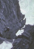 | 今日の相棒は後輩のAr君。第三尾根に向かうK君、In君とつれだって涸沢BCを出発、快調に南稜を登って 稜線までいつものように1.30’。松濤岩から南峰のガレをトラバースして、C沢左俣の下降にはいる。 クラック尾根取り付きのB沢に比べれば傾斜もゆるく、晴天で見通しがきくので、あの時ほどの緊張感はない が、落石を起こさぬよう慎重に下る。 右俣との合流点で、第三尾根組と別れ、ふみ跡をたどって第四尾根上のスノーコルに立ち、登攀開始。 Aカンテ、Bカンテと、トップを交替しながら快調に登り、Cカンテで先行パーティーに追いついて時間待ち。 滝谷は初めてのAr君、ややビビッタか、or 先輩に美味しいところを譲るつもりか、「トップをお願いします。」 ということで、Cカンテで硬い岩の感触と高度感を楽しみ、ツルムの頂上まで数ピッチは私がトップを続けた。 ツルムは第四尾根上のピークで、快晴のこの日、滝谷の真っ只中に屹立した岩峰に立つと、周囲は全て 絶壁が切れ落ち、まさに天馬に跨ったような爽快な気分だ。 ツルム頂上で一服しながら、先行パーティーがDカンテで苦闘している様子を観察、彼らがやっと乗越した のを見て腰を上げる。今度はAr君がトップで最後の難関を2 ピッチ、後は傾斜の落ちた草付きの斜面を 登って登攀終了。 いわうめの咲く斜面に座って、快晴の滝谷とその上に連なる笠・抜戸の山並みを眺めながら弁当を開いた。 (BC発;5.10、松濤岩;6.40、スノーコル;7.40〜8.00、Cカンテ下;9.15、ツルム;10.00〜11.00、終了;11.30) 予想以上に早く終わったし、滝谷に霧一つない快晴で、こんな滅多にないチャンスにそのままBCに帰るのは 勿体無いと北穂山頂からキレットへの縦走路をしばらく降り、滝谷のよく見えるテラスで、午後の一時をすご した。 先年、ガスと小雨の中を登ったクラック尾根、第一尾根が目の前にそそり立ち、第一尾根ではCフェースの オーバーハングに挑んでいるクライマーが豆粒のように眺められて、急いで望遠レンズのカメラにおさめた。 (北穂高山頂発;15.00、 BC着;16.15 ) |