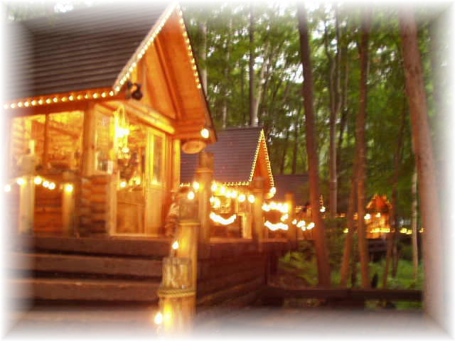 | このようにログハウスの店舗がウッドロードで結ばれ点在している。 この森には、ニングルという森の知恵者が住んでいる。 |