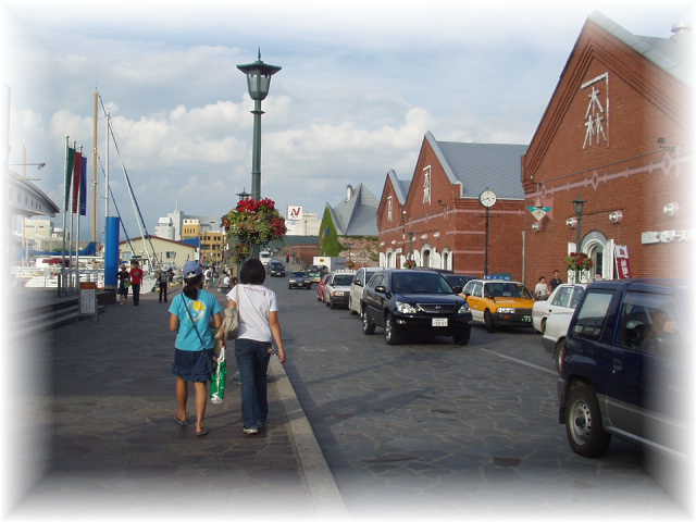 | 赤レンガ倉庫の前で。左側が函館港。 次はどこのお店に行こうかな〜。 |