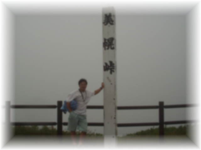 | 朝起きると、雨&霧。台風10号の影響だろうか、どんよりした天気である。美幌峠からの屈斜路湖の絶景を楽しみにしていただけに、不安をいだきながらの出発となった。心配は的中し、峠に近づくにつれて一層霧は濃くなり、走るのが精一杯となってきてしまいました。少し待ったが、晴れる気配もないので霧の中を写真だけ撮影してもらいました。寒かったなぁ。 |