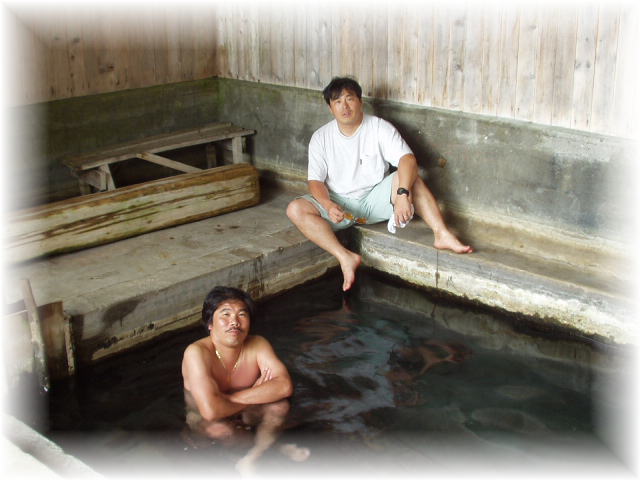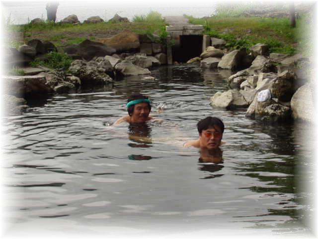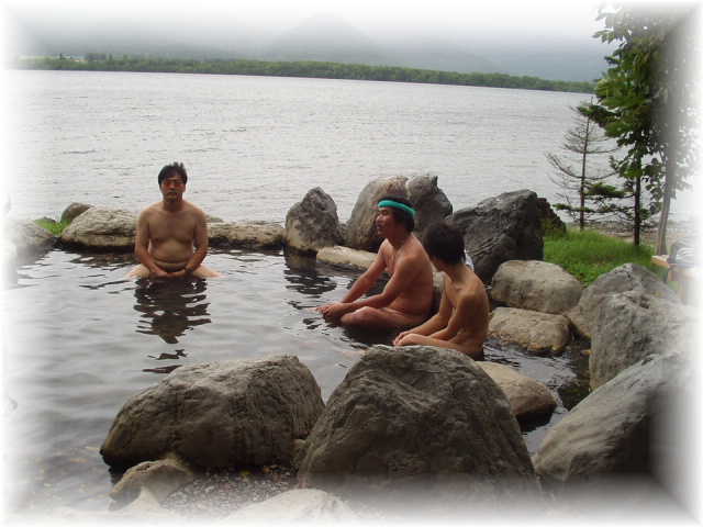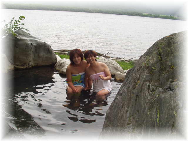 | あまりの寒さに身体も冷えてしまい、屈斜路湖畔の無料露天風呂で体を温めることにしました。まずは和琴半島温泉へ。霧はなかったが、やっぱり雨は降っています。それでも構わず、一人で露天風呂へ。ここで驚くべき体験をするんです。 なんと!若い女性ライダーが入浴していたのですよ。しかも一糸もまとわない姿で。こういう時って以外に弱気になるんだよね。頭の中ではラッキーなんて思ってながらも、なるべく見ないように見ないようにと隅っこにいって、なんだか緊張しちゃって。そそくさと車に戻りました。そのうち、とーちんがやってきてラフティング以来2日ぶりの再会でした。さっきの話をすると、さすがはとーちん。また一緒にいくことになりました。でも、柳の下にどじょうは2匹もいません。家族に見守られながら二人っきりで入ることになりました。今度はがっかりモードだったかな。 その後、和琴温泉露天風呂から半島の方へ歩いて5分くらいの公衆浴場に行きました。小屋の中に手作りの浴槽があります。あまりガイドブックに載っていないので、知られていないようです。なお、湯温は熱めですが、湖水で調整するようにうなってました。 温泉のハシゴをしようということで、次はコタン温泉に向かいました。ここでは、ママさん達も入浴! もちろん、一糸まとわぬとはいかず、バスタオルを巻いての入浴ですが.....。コタン温泉も屈斜路湖畔にあるのですが、ホント良い温泉です。 |