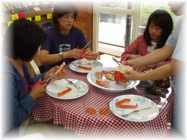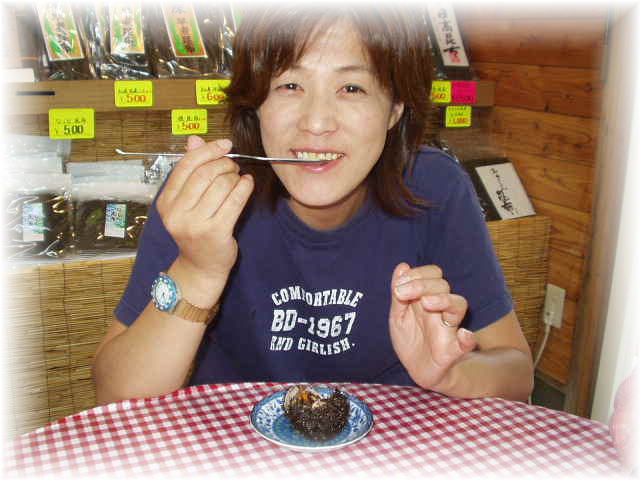 途中、ウニ一個200円&カニ一杯1000円なんて看板を見つけ、さっそく食べました。ウマカッタァ〜。それにしても安いよね。場所は、ゴジラ岩の正面にあるお店です。名前は忘れちゃった。 |