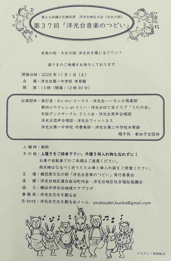 - 第37回洋光台音楽のつどいを11月1日(土)、13時から、洋光台第一中学校体育館にて開催いたします。