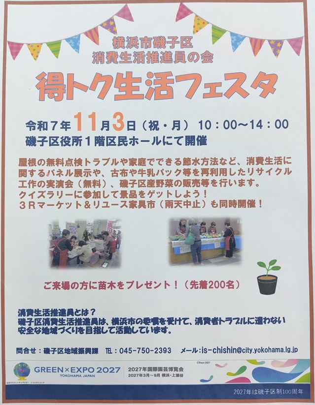 - 得トク生活フェスタを11月3日(月、祝)、10時~14時、磯子区役所1階区民ホールにて開催いたします。