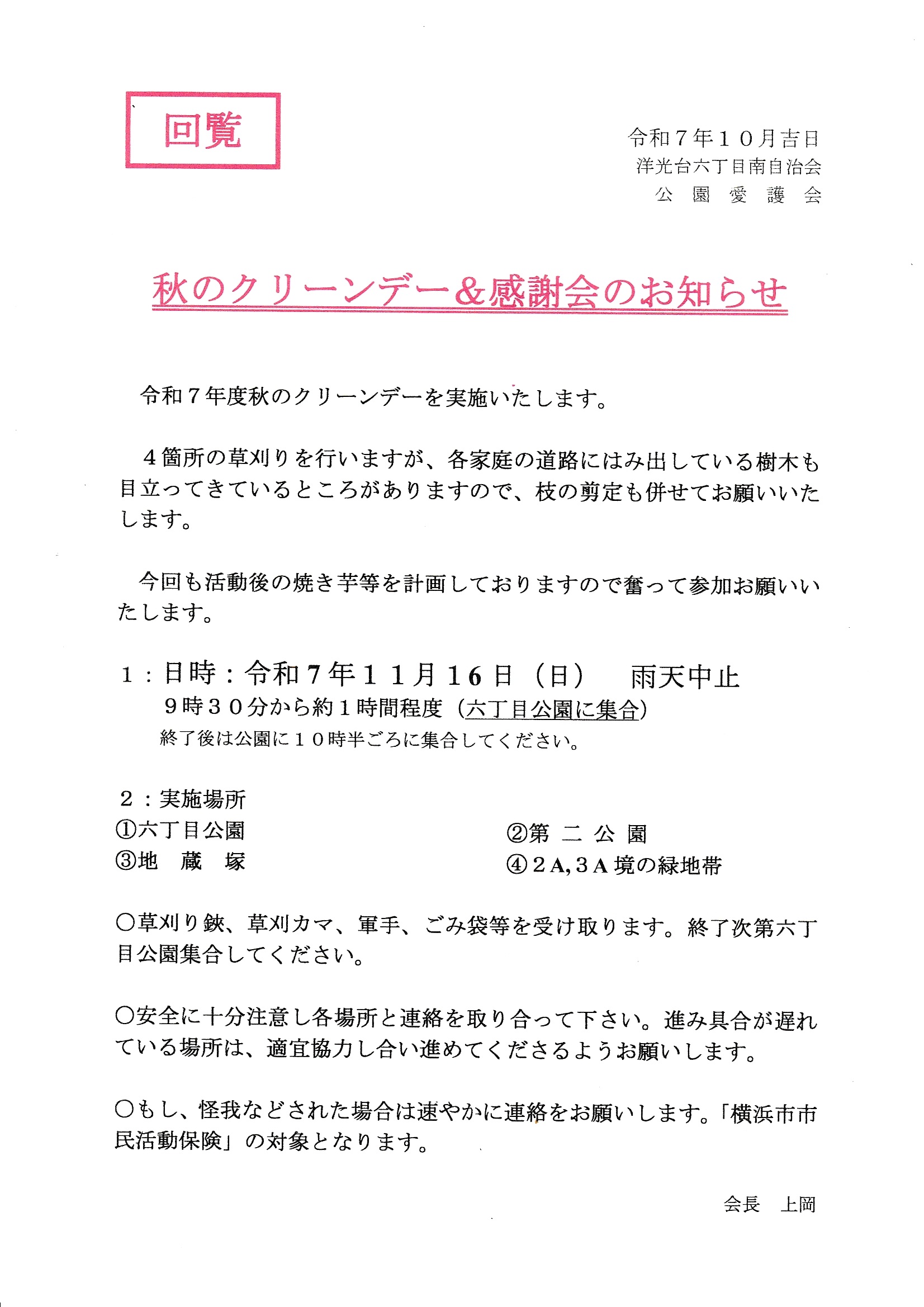 - 明日の秋のクリーンデーは、9:30から予定通り実施いたします。(2025/11/15 12:00)