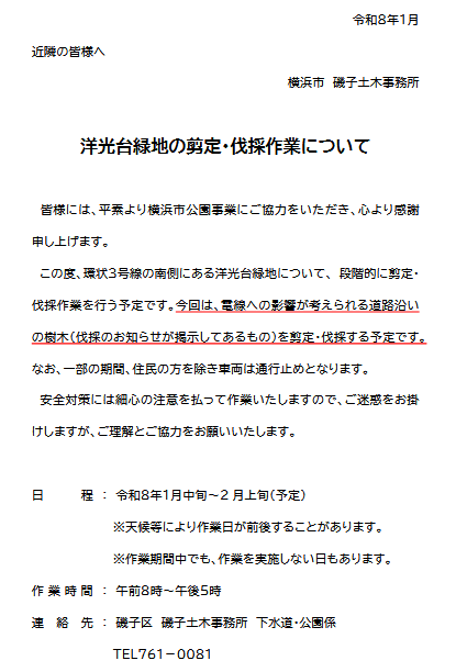 - 洋光台緑地の剪定・代採作業が1月中旬~2月上旬(予定)に実施されます。 詳細は、磯子土木事務所からの以下のご案内を参照ください。