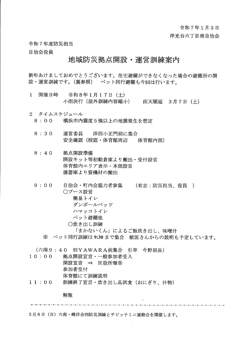 - 開催案内(2026/1/10) 地域防災拠点開設・運営訓練が1月17日(土)10時~11時過ぎに洋光台第四小学校で開催されます。