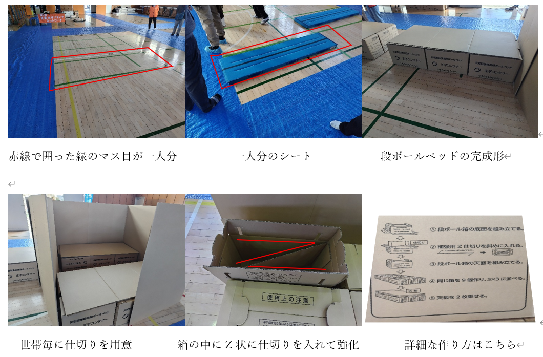 - 災害時、体育館は収容人数に制限があるため、家が倒壊等の被害がなければ、基本は在宅避難である。