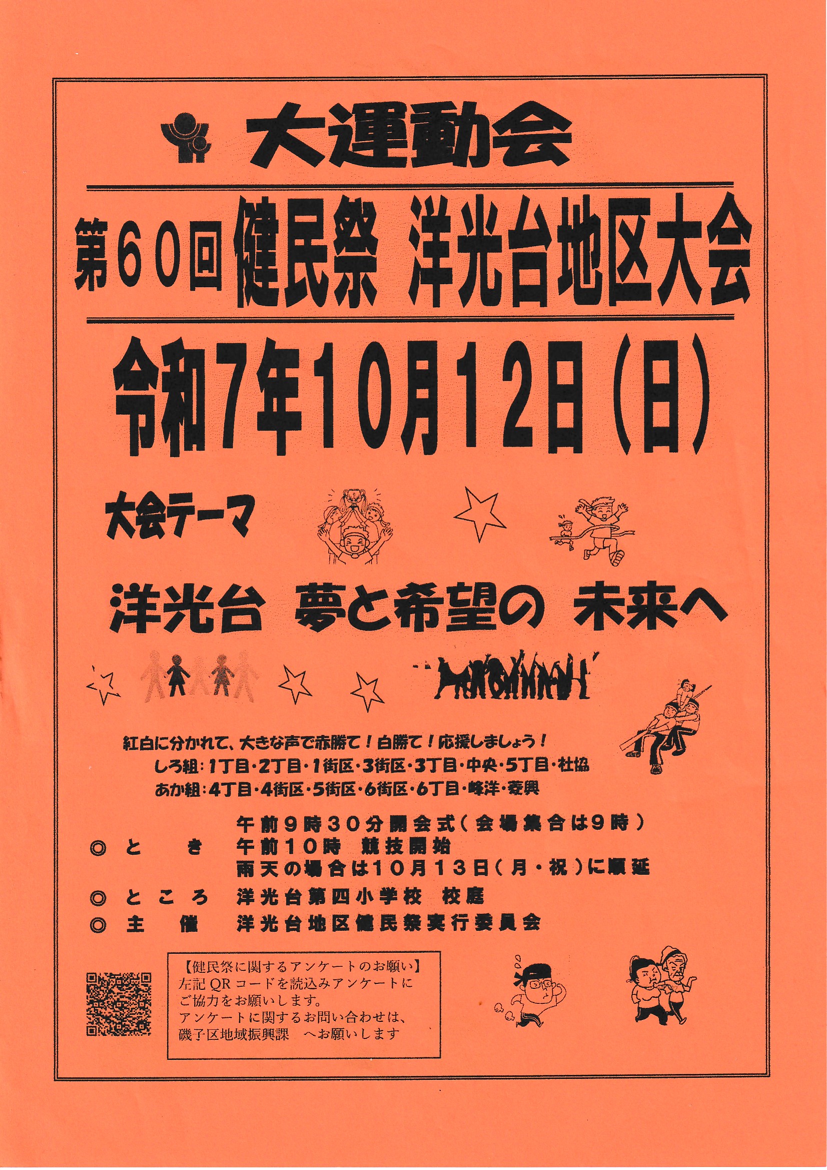 - 第60回 健民祭 洋光台地区大会を10月12日(日)に開催いたします。(2025/10/5) 現地集合時間:9時、開会式:9時30分となっています。多くの方のご参加お待ちしております。