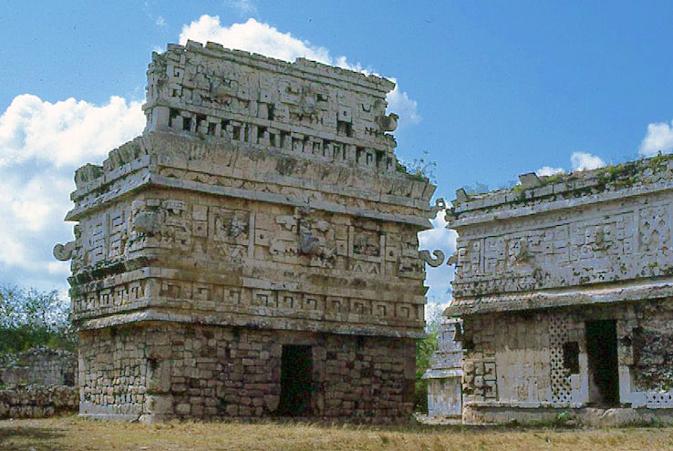 「聖堂」と「尼僧院」、チチェン・イツァ(メキシコ) 壁面全体が彫刻で埋め尽くされているが、「聖堂」の1階には無かったのか、 失われたのか。大柄のものは図像か装飾で、文字は小さく、あまり多くない。 文字が多く刻まれたのは、石碑、石棺、樹皮などであった。 The Church annexed to the Nunnery, Chichen Itza, 7-8th century.