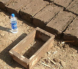 地球上で最も安価な建設材料は「土」である。下図のように、簡単な木の型枠(底なし)に、繊維質のワラやスサを混ぜて、水で柔らかくした粘土を入れ、しばらくして型枠を抜き、天日で乾かすと、手に持って作業ができるサイズの 「日乾しレンガ」 ができる(ニュー・グルナにて)。