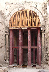 しかし、石やレンガでアーチを作るには 下図のように、中東では高価な木材による型枠、支保工が要る(アシュートの白修道院での修復工事、ここでは 下部に鉄骨を用いている)。