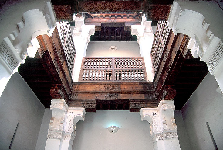 One of the small courts of the dormitory in Ibn Yusuf Madrasa, upper and lower floors of which are surrounded with students' rooms. There is no greenery, despite being open to the rain.