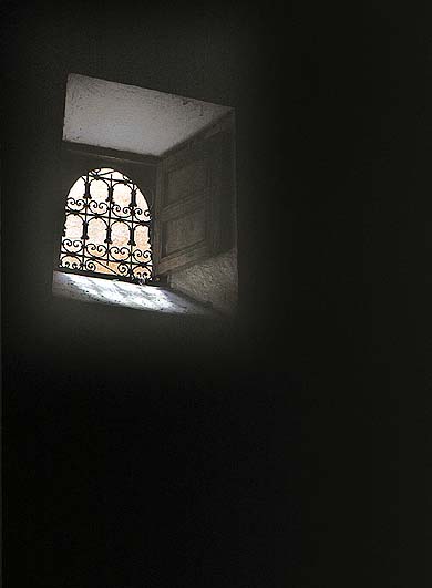 A high window of a dormitory room in Ibun Yusuf Madrasa, Marrakesh. It shows monastery-like sobriety and Islamic aesthetics.