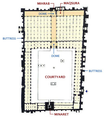 The buildings surrounding the courtyard make an austere impression as early Islamic architecture with little embellishment. The elements breaking its monotony are the small domes of the northern grand minaret and the central part of the southern side of the worship hall.