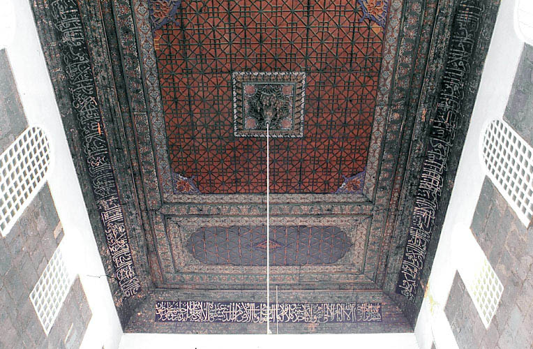 周囲にカリグラフィー、上面に彩色幾何学紋、照明器具下げ口にムカルナス。