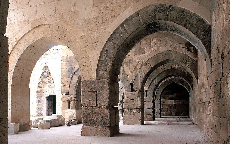 Inside of a cloister surrounding the courtyard of the Caravanserai in Sultanhani It is supported exclusively by square pillars, without a round column. The entrance Iwan of the hypostyle hall is seen in the background.