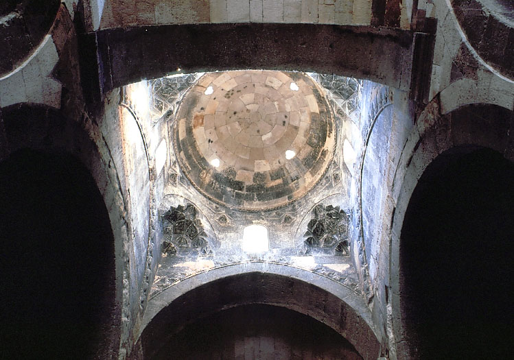 The dome above the central bay of the hypostyle hall, the Caravanserai of Sultanhani. The squinches, which change a square plan to octagonal, are embellished with Muqarnas.