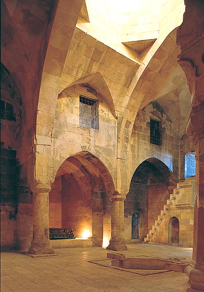 The 'interiorized courtyard' of the Hospital (Darüssifa). Light comes through the top-light above the fountain on the floor.