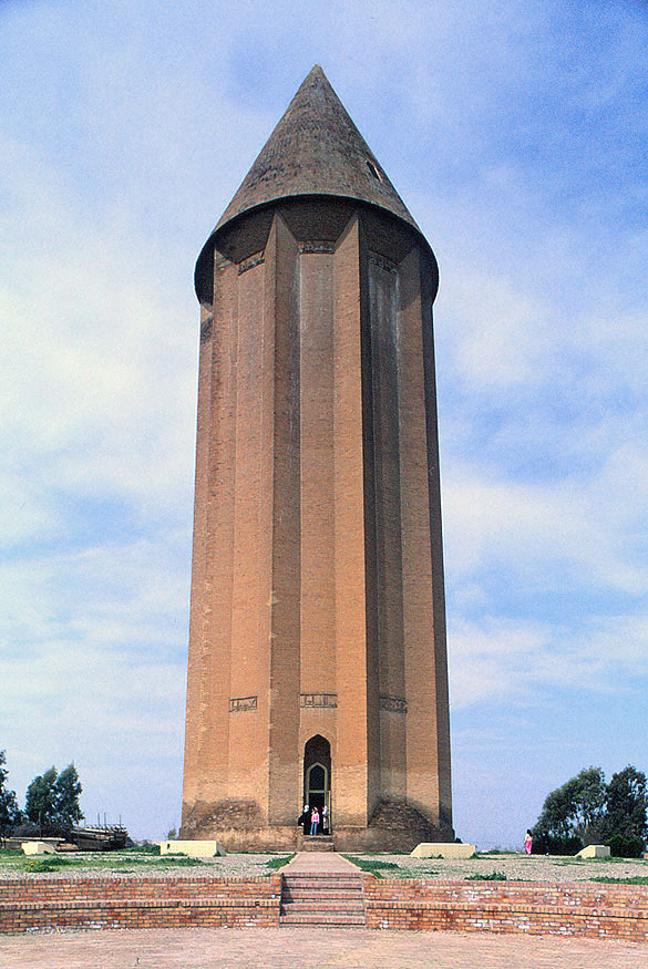 ゴールガーン近在の塔墓、カーブース廟 東面、ゴンバデ・カーブース、1006/7年 今から一千年も前の建築デザインとは信じがたいほどのモダーンさ! 十角形の星型プランに、高さ51mの塔と円錐屋根の 幾何学立体。 上質の焼成レンガですべて作られているので、タイルで覆われることもなしに、1000年の風雪に耐えてきた。 これこそ イラン建築の最高傑作(のひとつ)であると思う。