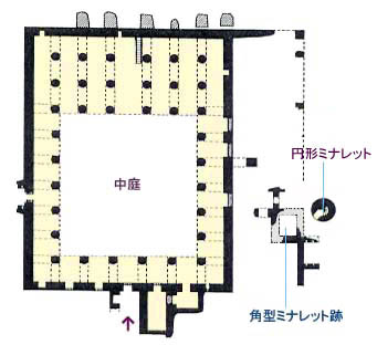しかしモスクをよく見ると、礼拝堂の中央列のスパンのみが他よりも幅広く、その半円筒形ヴォールト天井の前面には、ササン朝ペルシアの伝統を引く 背の高いイーワーン(大きなアーチ開口の奥の半外部空間)となっているし、またレンガの積み方も 小端立て積みと平積みを交互に繰り返す イランの伝統的なものであるから、プランの形式こそアラブ型だが、技術や造形の上では ペルシアの伝統を守り続けていたと言える。