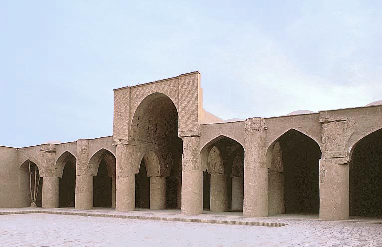 The worship hall of the Tarik Khane Mosque, Damghan. It is not certain if there was originally a Pishtaq (arched portal with high wall) above the Iwan-like central span, the barrel vault of which is a restoration work.