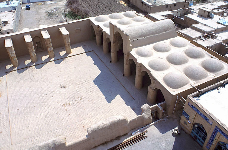 The Tarik Khane Mosque seen from the top of the Minaret, Damghan. The roof of the central nave is a barrel vault and the two wings are continuous domes. Most of the cloisters surrounding the courtyard have been lost.
