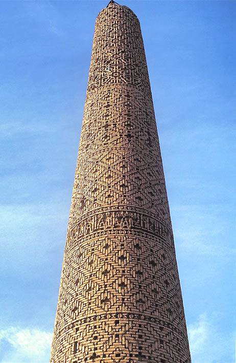 Ther round minaret constructed in the 11th century instead of the lost square minaret. It is covered with geometric patterns made by the device of piling bricks in various ways and chiseled Arabic calligraphy of Kur'an.