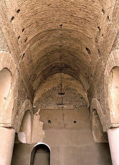 The barrel vault of the central nave in the Tarik Khane Mosque The Mihrab is located on the lower left, presumably because of the installation of the Minbar on the right.