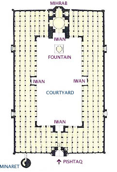 It can be said the restoration was a complete success, normously recovering fine views efrom a dilapidated state seen in old photographs. The mosque still was not decorated excessively like the gatehouse, the reason of which might be that the whole design of this mosque was originally so simple in composition with nerely restrained plain ornamentation. The plan of the Kalan Mosque is the Four-Iwan-type of Persia, with a single tree in the foreground of the courtyard and the 19th centuryfs octagonal kiosk (fountain for peoplefs ablutions) in the background. The surrounding galleries with uniform arcades are punctuated by four Iwans standing loftily in the center of each side. This yard space, which limits elements of colors and shapes to the fewest, seems to have a sacred atmosphere as if to invite deep meditation.
