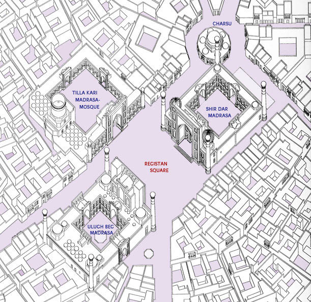 Isometric drawing of the Registan Square Complex, Samarkand.