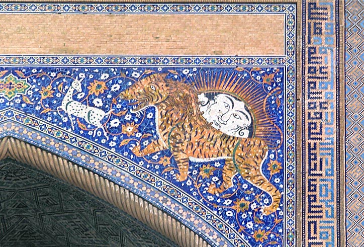 A mosaic depicting a lion and the sun's face at the Pishtaq of the Shil Dar (meaning 'lion-possessing') Madrasa. The lion resembles a tiger as well due to its striped fur.