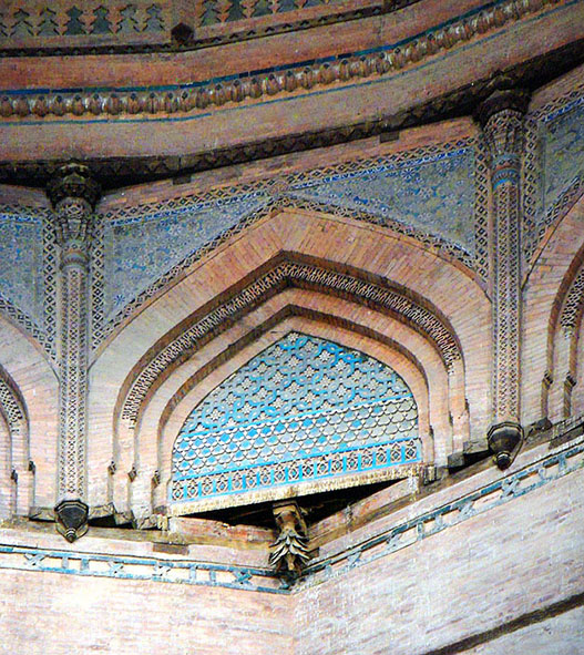 The details of transitional part from octagon to circle of the Dome in the mausoleum of Rukn-i Alam. Blue glazed tiles are understatedly but effectively used around squinches.