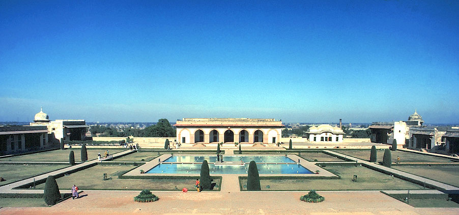 33年前のラホール城。 すべてが四分庭園の幾何学的秩序の上に建っている。 公謁殿(ディーワーニ・アーム)のうしろ側の、ジャハーンギールの庭院(クlヮドラングル)。 正面はジャハーンギールの寝室(フワブガー)で、現在は博物館になっている。