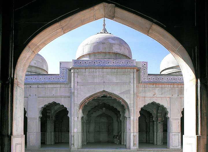 ラホール城内の宮廷礼拝堂、真珠モスク(モティ・マスジド)、1654年 アーグラやデリーの同名のモスクと同じく、すべて白大理石で仕上げられ、中庭に面する礼拝室には3つのドーム屋根を戴いている。中庭が小さいので、全体の写真を撮るための引きがとれない。 パラペットのタイル以外に、ほとんど装飾がなく、チャトリもない、禁欲的なモスクである。 The Moti Masjid (Pearl Mosque) in the Lahore Fort, 1654.