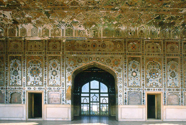 ラホールの城内の北隅に位置するのは シャー・ジャハーン帝の後宮で、シャー・ブルジュ(王の館)と呼ばれる。 メインの建物であるシーシュ・マハル(鏡面殿)は王妃の居室で、内部は鏡細工による華麗なインテリアとなっている。 Interior of the Shish Mahal in the Lahore Fort.