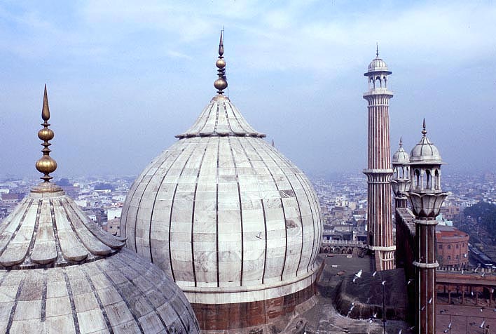 Domes and Minarets of Jami Masjid (Friday Mosque), Delhi, 1650-56. The bulbous domes of white marble and minarets are patterned with stripes. They are outer shells of double-shell domes to beautify the external appearance.